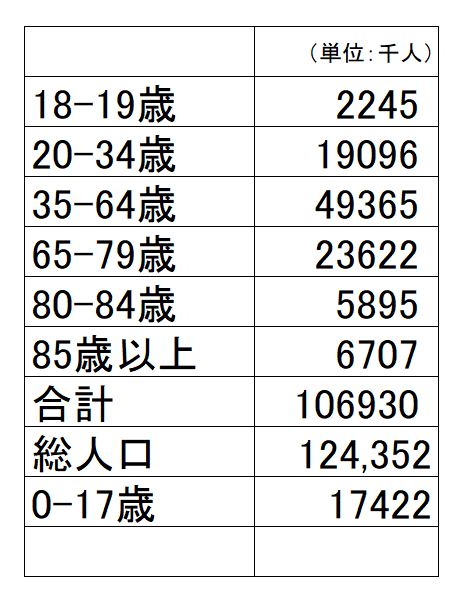 20~34歳の有権者数は約19,096,000人で割合は17.86%、35~64歳の有権者数は約49,365,000人で割合は46.17%、それに18~19歳の約2,245,000人の2.10%です。