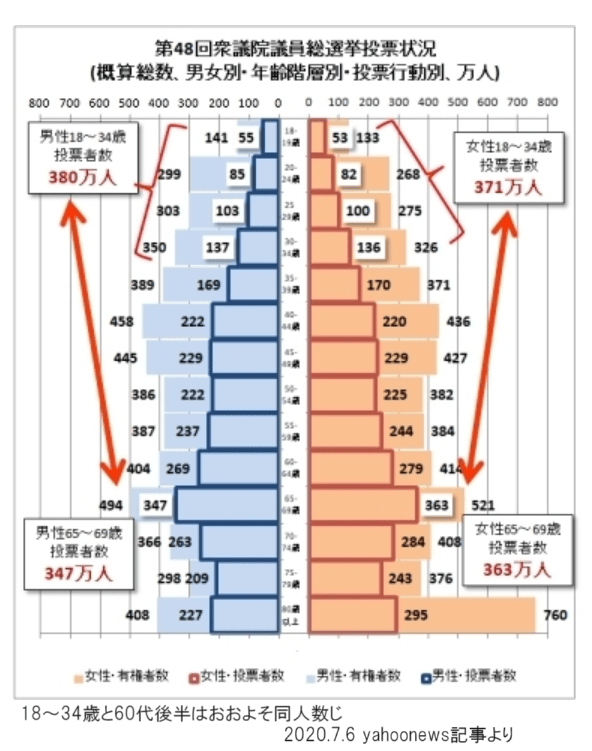 18~34歳の投票率が低く、投票者は男女合わせて約751万人、対比して65~69歳の男女合わせると約710万人でほぼ同人数くらいです。