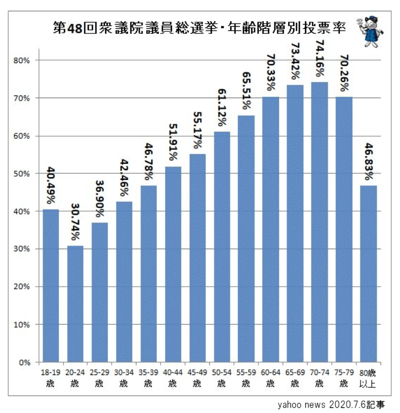 前々回になりますが第48回をみると投票率が特に低いのは18~34歳であり、年齢別有権者の38%に至りません。