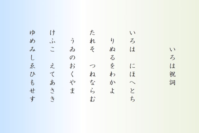 いろは、にほへとち、りぬるをわかよ、たれそ、つねならむ、うゐのおくやま、けふこ、えてあさき、ゆめみしゑひもせすん