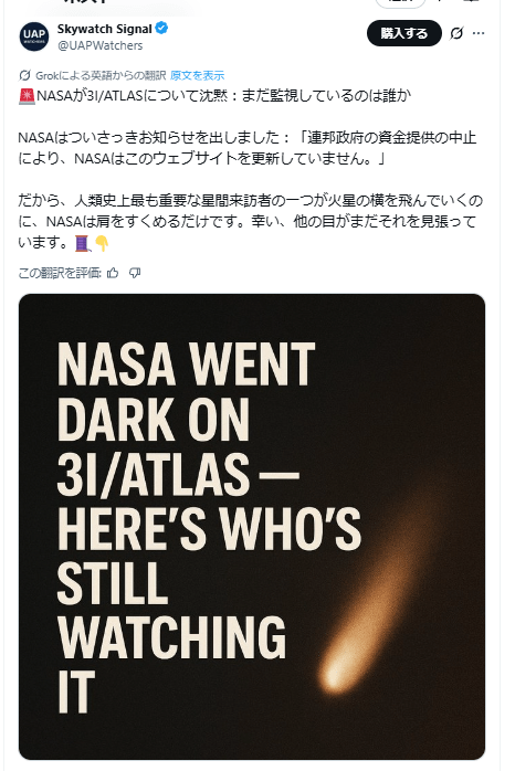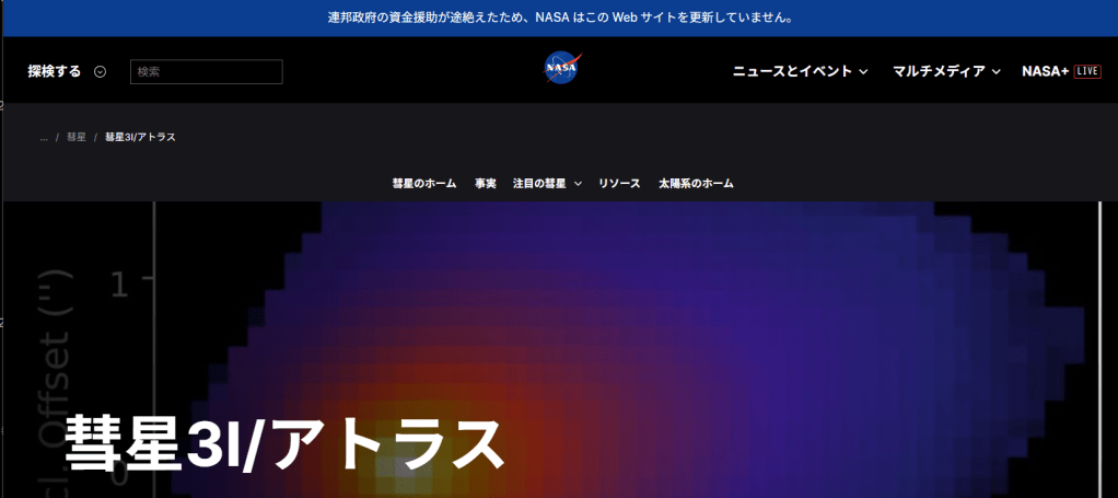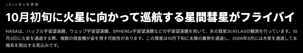 ・3I /ATLAS(3I/アトラス)が10月3日に火星に接近しましたがNASAと欧州宇宙機構は情報をシャットダウンしています。知的生命体の存在について議論されています。10月20~21日に地球に接近しますが肉眼では見えません。