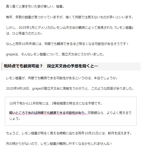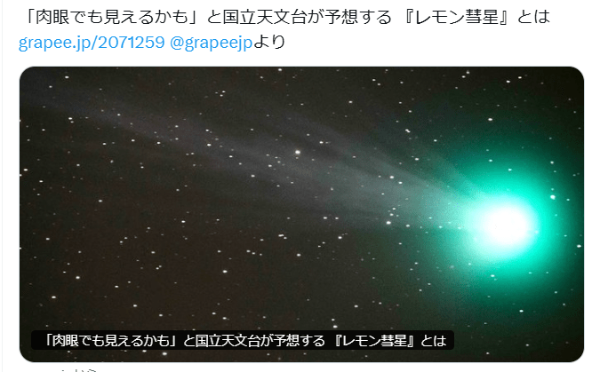 レモン彗星 10月末には肉眼で見える可能性 「肉眼でも見えるかも」と国立天文台が予想する 『レモン彗星』とは https://grapee.jp/2071259