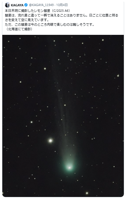 10月4日 本日未明に撮影したレモン彗星(C/2025 A6) 彗星は、流れ星と違って一瞬で消えることはありません。日ごとに位置と明るさを変えて空に見えています。 ただ、この彗星は今のところ肉眼で楽しむのは難しそうです。 (北海道にて撮影)10月4日 リポスト