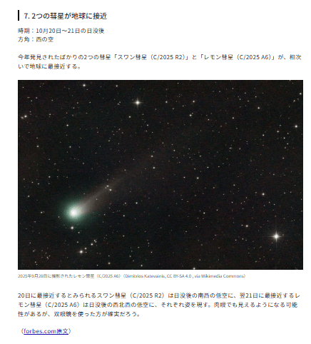 時期:10月20日~21日の日没後 方角:西の空 今年発見されたばかりの2つの彗星「スワン彗星(C/2025 R2)」と「レモン彗星(C/2025 A6)」が、相次いで地球に最接近する。