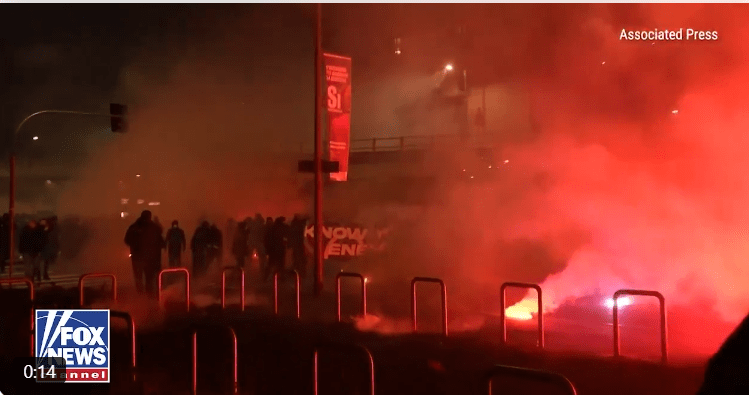 通りでの混乱:イタリアのオリンピックでの抗議デモ後、マスクをした人々が警察に向かって花火を打ち上げた。