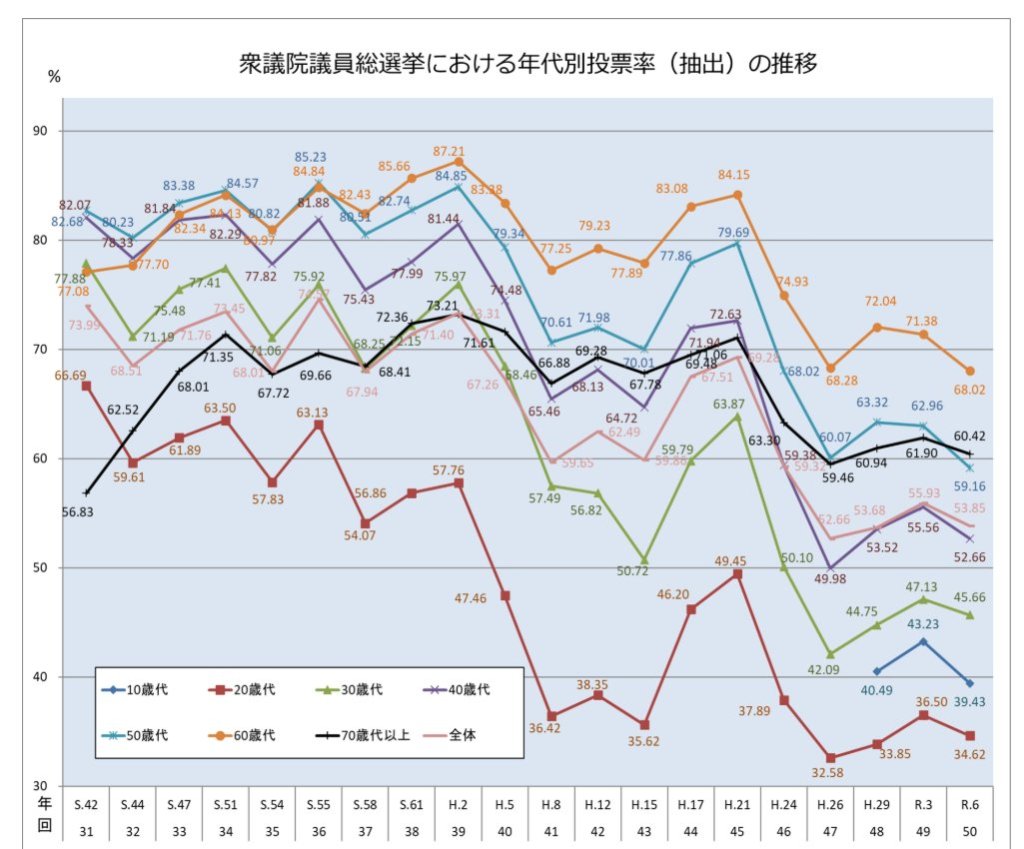 衆院選2026 過去の投票率年代別 総務省